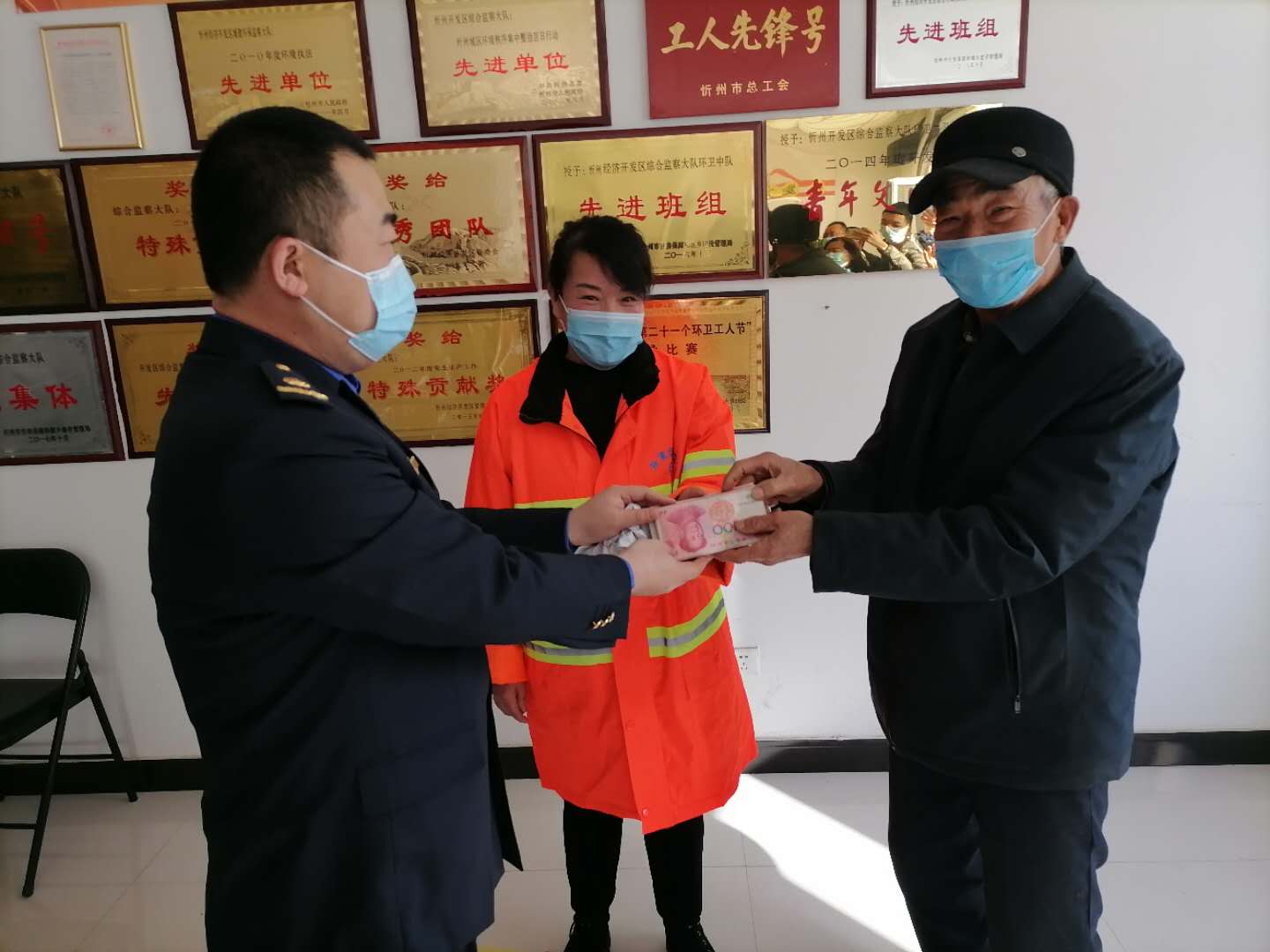 2月5日上午,來到忻州開發(fā)區(qū)城管綜合執(zhí)法隊辦公室。連日來,因丟失2萬元現(xiàn)金籠罩在69歲農(nóng)民工趙大爺和他一家人心頭的煩惱和惆悵一掃而光。