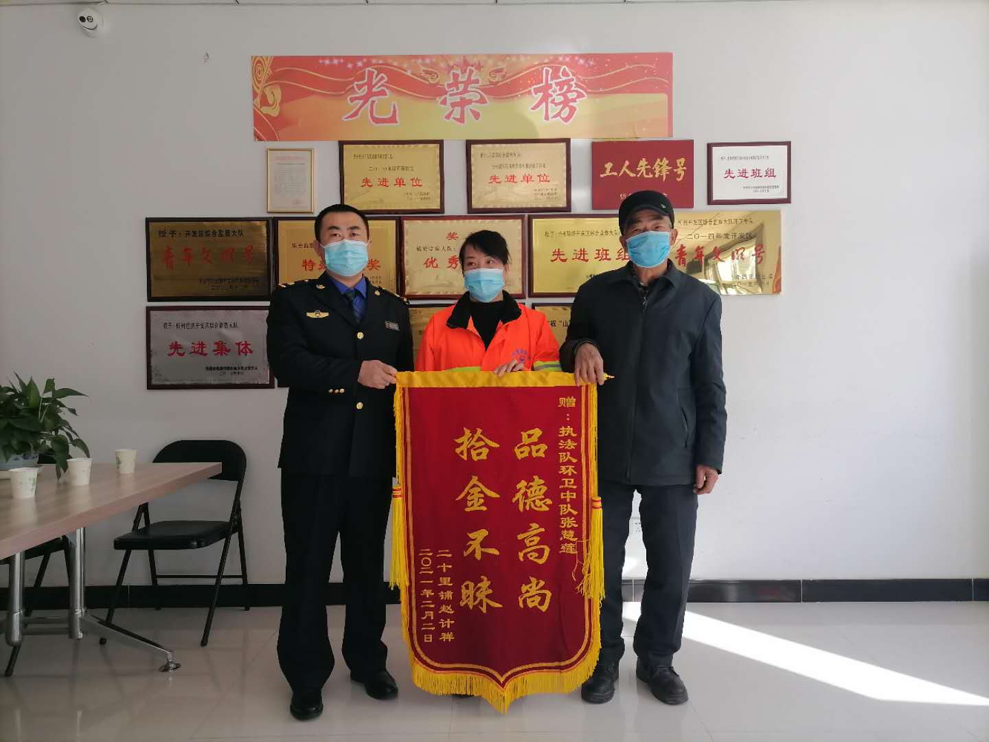 “真是遇到了好心人,我們一家人這下可以安心過個年了!……”當(dāng)泛華小區(qū)門衛(wèi)趙大爺親手接過失而復(fù)得的巨額現(xiàn)金時,抑制不住內(nèi)心的激動,緊緊握著環(huán)衛(wèi)女工張慧蓮的手不停地道謝,并送上全家人的心愿“拾金不昧 品德高尚”錦旗。