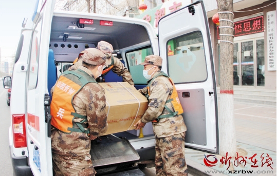 圖為民兵在搬運(yùn)防疫物資。