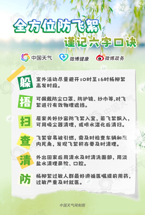 京津冀楊柳絮飄飛可持續(xù)至5月,飛絮中或攜帶花粉、灰塵等多種過敏原,被人體吸入后,易引發(fā)過敏性鼻炎、哮喘等疾病。飛絮如何防?如何降低過敏風(fēng)險(xiǎn)?中國(guó)天氣網(wǎng)總結(jié)了躲、捂、掃、查、清、防6字口訣,助你全方位防護(hù)飛絮。
