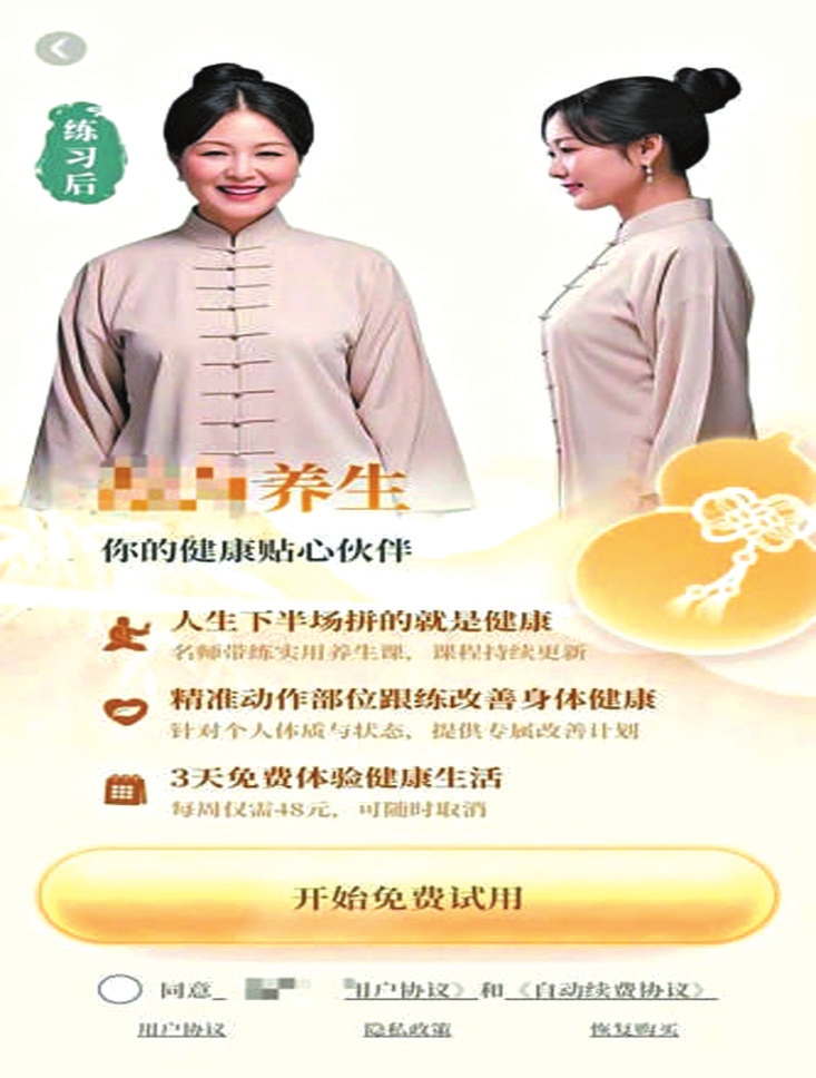 還有些App則更加離譜,下載完成后,點(diǎn)進(jìn)去的第一步就是要購買會員,之后才能正常使用。但在購買流程上,平臺卻耍起了花招。比如一款提供“養(yǎng)生指導(dǎo)服務(wù)”的App,頁面上會有一個大大的按鈕,寫著“開始免費(fèi)試用”。但在按鈕的旁邊,卻有一行非常不起眼的小字:“每周僅需48元,可隨時取消?!倍坏┯脩酎c(diǎn)擊開始試用,系統(tǒng)就會跳轉(zhuǎn)到自動續(xù)費(fèi)的開通界面。如果是辨別能力差的老人,可能還以為是在填寫什么注冊信息。