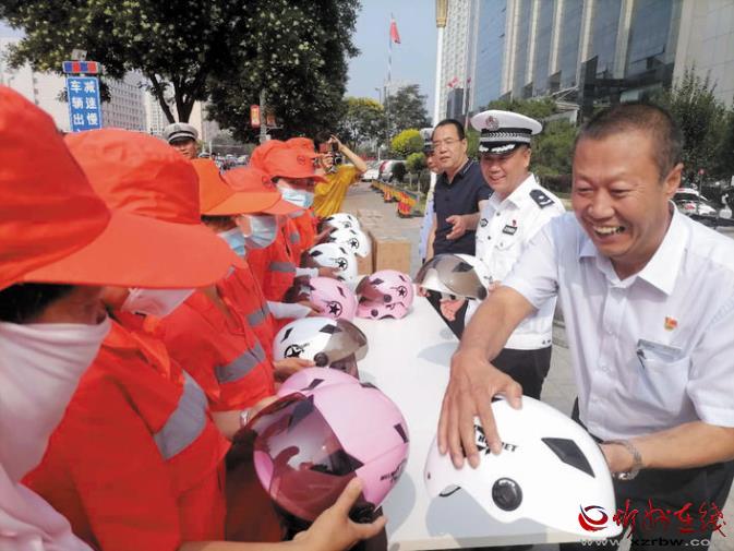 今年是我市創(chuàng)建全國文明城市的決戰(zhàn)決勝年,廣大環(huán)衛(wèi)工人一直默默奮斗在崗位上,為我市創(chuàng)文不斷努力。市公安局交警支隊始終牽掛著奮戰(zhàn)在基層一線的環(huán)衛(wèi)工人,支隊以此次贈送頭盔活動為契機,持續(xù)關心關愛環(huán)衛(wèi)工人的生命安全和身體健康。市公安局交警支隊負責人表示:“環(huán)衛(wèi)工人大多騎著電動三輪車或人力保潔車穿梭在大街小巷,機動車道是他們的主要作業(yè)區(qū)之一,佩戴安全頭盔,可以大大增加他們的安全系數(shù)。同時,環(huán)衛(wèi)等重點行業(yè)的示范引領作用,將有力帶動市民遵紀守法、安全出行,為文明城市創(chuàng)建打造一道亮麗的風景線?!眻D為捐贈活動現(xiàn)場。張志遠 攝影報道