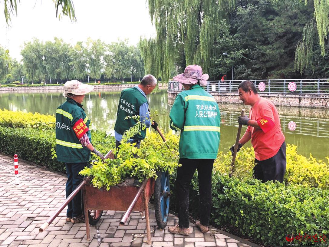 為美化綠化人居環(huán)境,營(yíng)造“文明健康 有你有我”的社會(huì)氛圍,近日,佩戴“文明使者”袖章的園林工人在人民公園進(jìn)行苗木補(bǔ)植,對(duì)花卉進(jìn)行更換,助力我市創(chuàng)建全國(guó)文明城市。 張 曄 攝
