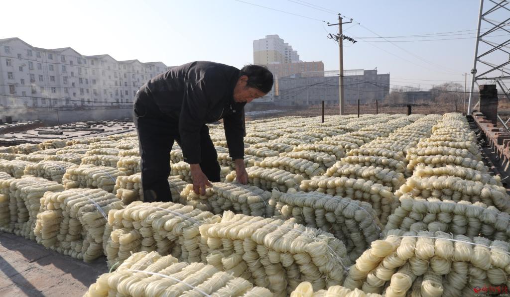 12月23日,原平市新原鄉(xiāng)班村老賈粉條加工廠內(nèi),老賈正在打捆制作好的粉條。老賈加工粉條已有30多個年頭,生產(chǎn)的傳統(tǒng)手藝無添加劑綠色粉條,很受市民青睞,不僅占領(lǐng)了本地市場,還遠銷大同、包頭,產(chǎn)品供不應求。 (褚 震 攝)