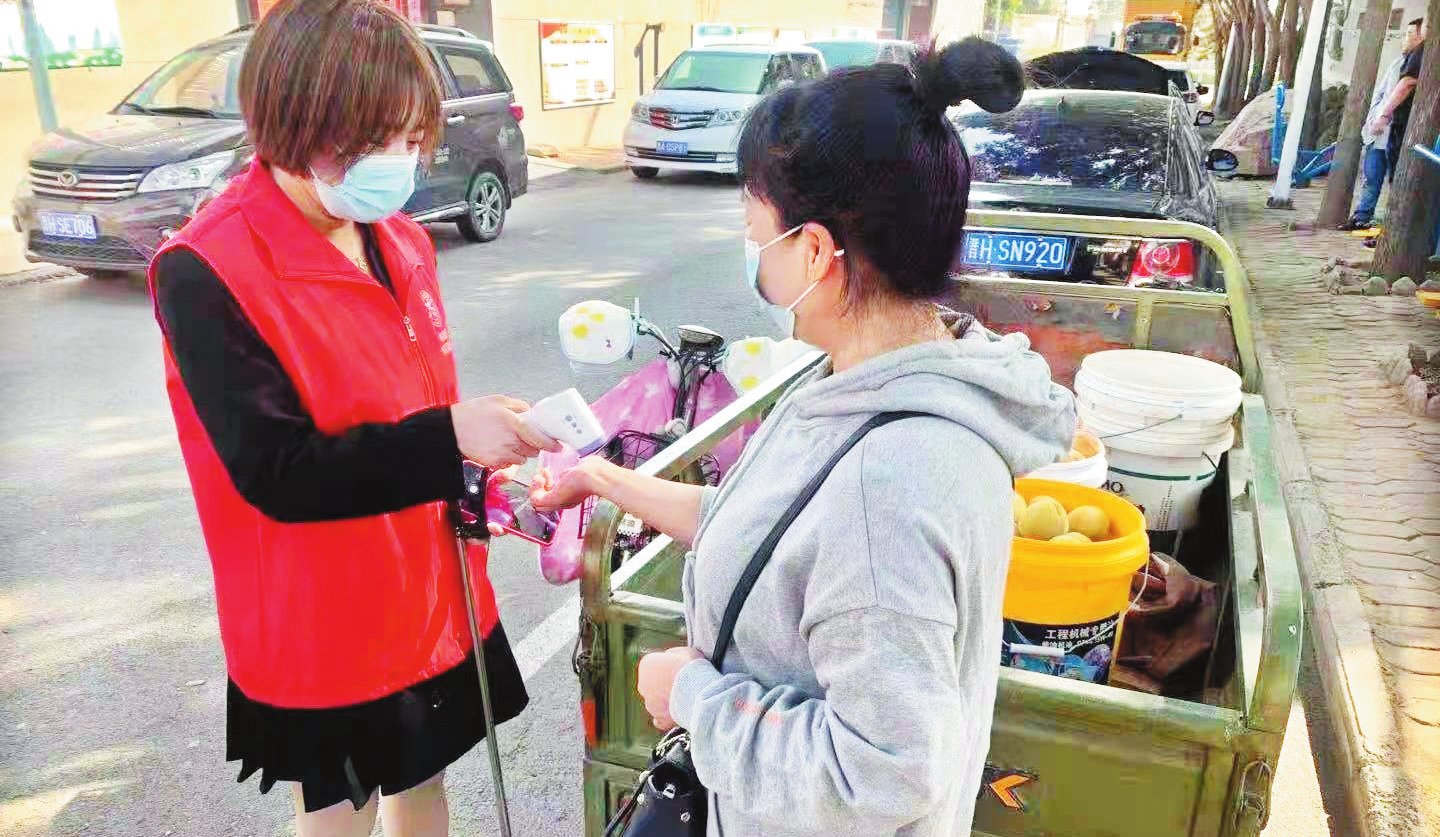 忻府區(qū)南街村新時代文明實踐站的志愿者在橋西街巷為居民測體溫。 許寧寧 攝