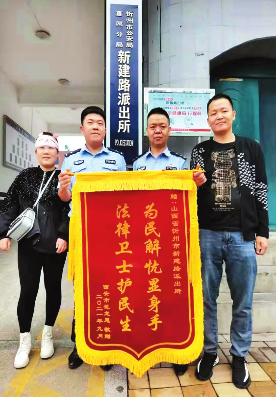 近日,一對(duì)西安夫婦將一面錦旗送到了忻州市公安局直屬分局新建路派出所,紅絨絨的錦旗上繡著14個(gè)金黃大字:“為民解憂顯身手,法律衛(wèi)士護(hù)民生?!?/p>