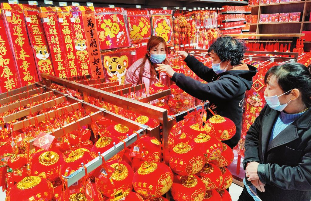12月27日,顧客在原平市小商品市場(chǎng)挑選新年飾品。新年臨近,該市小商品市場(chǎng)內(nèi)的虎年對(duì)聯(lián)、生肖飾品、紅燈籠、中國(guó)結(jié)、窗花、福字等新春飾品大批上市,選購(gòu)者絡(luò)繹不絕。(褚 震 攝)