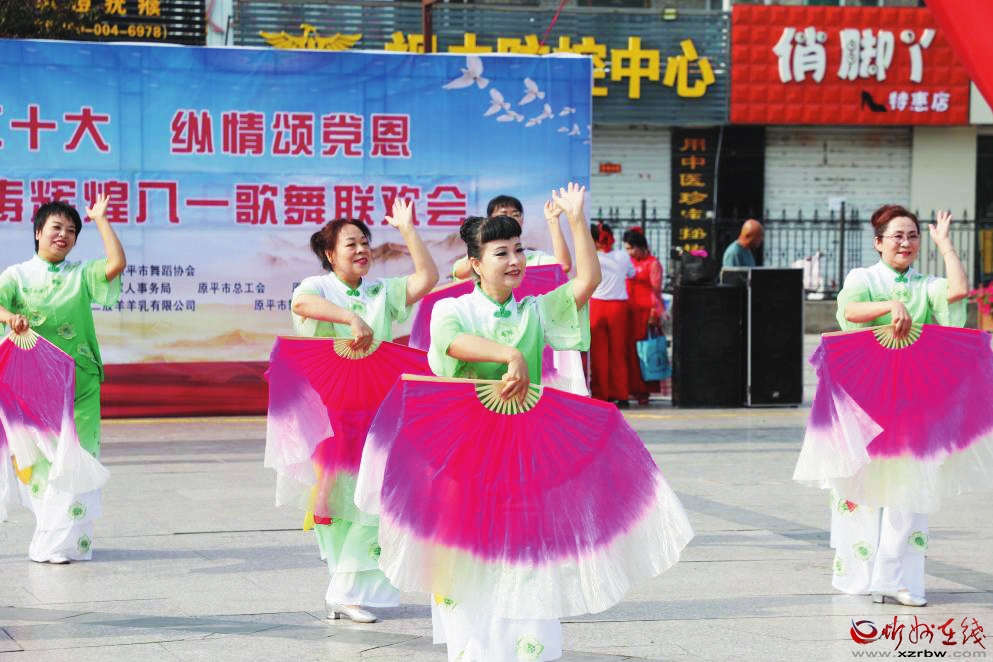 上午8時,在現(xiàn)場觀眾的歡呼聲中,歌舞聯(lián)歡會激情開幕。城西社區(qū)藝術(shù)鑼鼓隊首先上場,激越的鼓點鏗鏘有力、澎湃高亢,打出了振原平雄風(fēng)、鑄原平輝煌的雄心壯志;旗韻模特藝術(shù)協(xié)會的廣場舞《唱支山歌給黨聽》,舞姿翩翩、悠揚(yáng)情深;廣場舞《我和我的祖國》,體現(xiàn)了“祖國偉大,我愛祖國”的主題;廣場舞《盛世歡歌》《共筑中國夢》,深情抒發(fā)了同心共筑中國夢的時代激情;快樂健身舞蹈隊的《扇子舞》,別出心裁,特色鮮明;原平市大金操隊的廣場舞《火了 火了 中國》和觀眾發(fā)生強(qiáng)烈共鳴,現(xiàn)場許多人情不自禁舞動起來。聯(lián)歡會以團(tuán)結(jié)協(xié)作、勇敢奮進(jìn)為精神,向八一建軍節(jié)獻(xiàn)禮高歌。