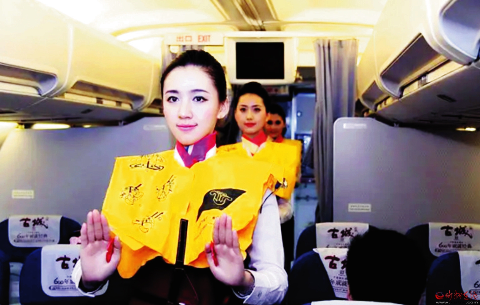 圖為工作人員在飛機起飛前為旅客進行安全知識講解。