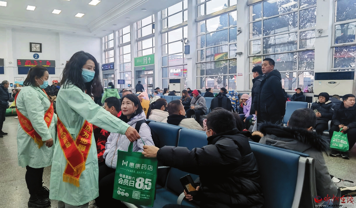 近日,國內(nèi)知名藥企廣州白云山和記黃埔中藥有限公司攜手我市當(dāng)?shù)厮幤箝_展春運(yùn)愛心公益活動。圖為工作人員在忻州火車站向候車乘客發(fā)放防流感藥品、口罩等健康禮包。(李建中攝)