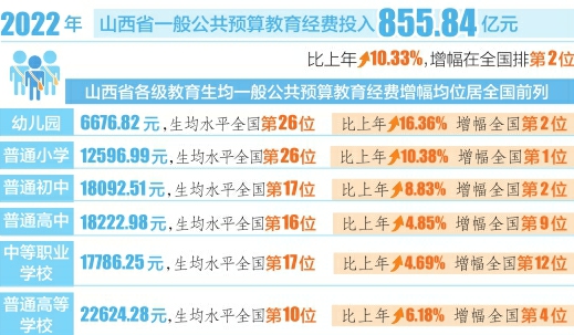 山西日?qǐng)?bào)訊(記者任志霞)日前,教育部、國家統(tǒng)計(jì)局、財(cái)政部發(fā)布了2022年全國教育經(jīng)費(fèi)執(zhí)行情況統(tǒng)計(jì)公告(以下簡稱統(tǒng)計(jì)公告)。統(tǒng)計(jì)公告顯示,2022年山西省一般公共預(yù)算教育經(jīng)費(fèi)投入855.84億元,比上年增長10.33%,增幅在全國排第2位。