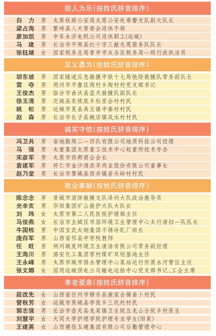 本次活動(dòng)評(píng)選出山西助人為樂(lè)好人、山西見義勇為好人、山西誠(chéng)實(shí)守信好人、山西敬業(yè)奉獻(xiàn)好人、山西孝老愛親好人共31人。