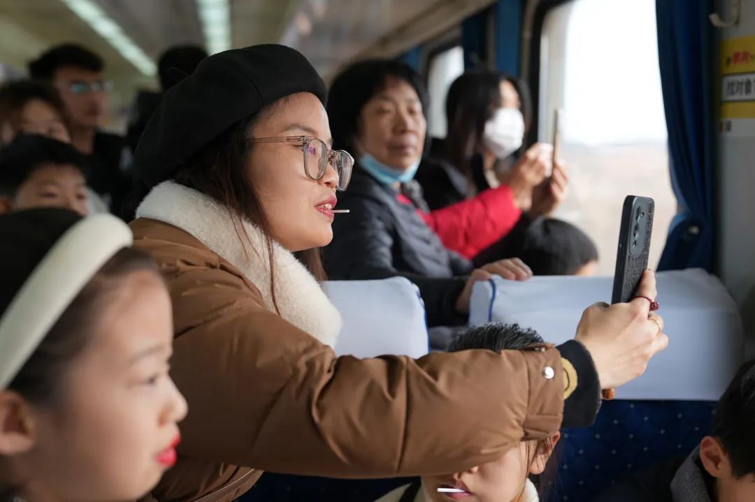 列車駛出運(yùn)城站,工作人員開始為旅客熱心介紹打卡拍照的最佳地點(diǎn)和周邊的名勝古跡,并且精心準(zhǔn)備了小道具,方便大家打卡拍照。
