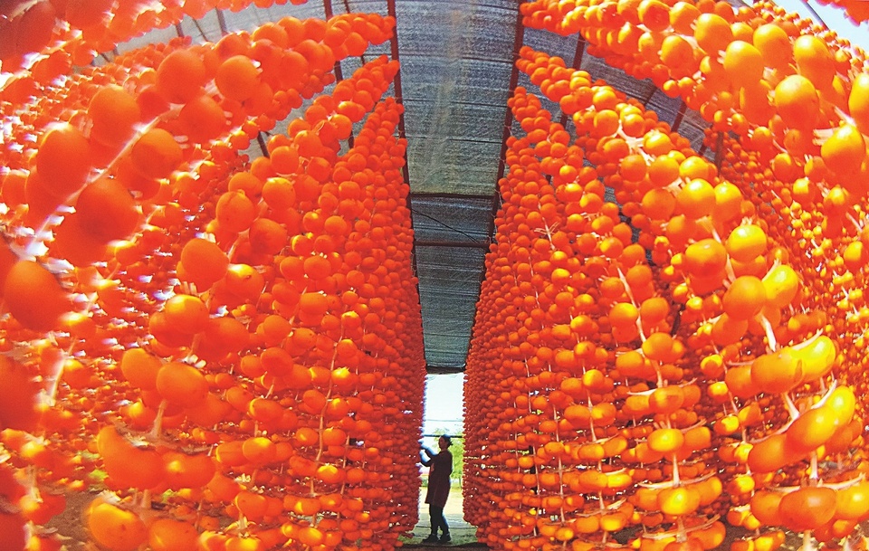 金秋時(shí)節(jié),山西省運(yùn)城市新絳縣陽王鎮(zhèn)禪曲村的柿子迎來豐收,連片金黃的果實(shí)掛滿枝頭。在該村種植加工大戶許永安的“家庭微工廠”,柿農(nóng)們正忙著將柿子削皮加工、上架晾曬。
