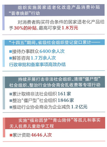 “十四五”期間,我省堅持“規(guī)范與發(fā)展并重、監(jiān)管與服務(wù)并舉”,持續(xù)深化改革,健全體制機制,完善政策措施,推動社會組織高質(zhì)量發(fā)展取得新成效。推行“零見面審批、最多跑一次”和線上年報“零跑動”,省、市、縣三級社會組織登記實現(xiàn)“一網(wǎng)通辦”。統(tǒng)一規(guī)范申請材料、表格表單、辦事流程、章程文本等,政務(wù)服務(wù)標準化、規(guī)范化水平持續(xù)提升。推進社會組織規(guī)范化建設(shè),健全綜合監(jiān)管、聯(lián)合執(zhí)法、資金管理等制度機制,加強對社會組織名稱、宗旨、業(yè)務(wù)范圍、發(fā)起人和擬任負責(zé)人的審核把關(guān),強化對社會組織內(nèi)部治理、人員、資金、活動等日常監(jiān)管。持續(xù)開展打擊非法社會組織、清理“僵尸型”社會組織、整治行業(yè)協(xié)會商會亂收費等專項行動,推動行業(yè)協(xié)會商會為企業(yè)減負1.2億元。