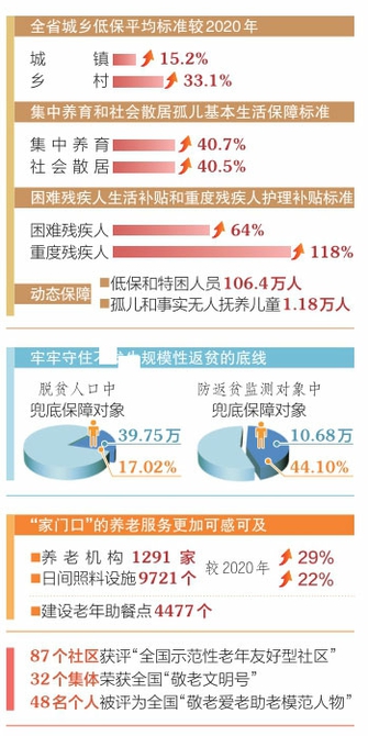 “目前,全省城鄉(xiāng)低保平均標準分別達到每人每月669元、555元,已有11個縣(市、區(qū))實現(xiàn)城鄉(xiāng)低保標準相統(tǒng)一?!笔∶裾d黨組書記、廳長李建紅介紹,我省建立最低生活保障標準與人均消費支出掛鉤的動態(tài)調(diào)整機制,從2022年起,各縣(市、區(qū))城鄉(xiāng)低保標準分別按當(dāng)?shù)厣夏甓瘸青l(xiāng)居民人均消費支出的30%—40%和45%—55%確定。