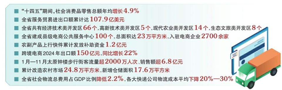 數(shù)字顯示,“十四五”期間,社會消費(fèi)品零售總額年均增長4.9%,建成100個(gè)鄉(xiāng)村e(cuò)鎮(zhèn),打造了大同黃花等113個(gè)區(qū)域公用品牌。農(nóng)產(chǎn)品上行快件補(bǔ)助帶動(dòng)約33億元農(nóng)產(chǎn)品銷售。實(shí)物商品網(wǎng)上零售額年均增長24.1%,高于全國17.1個(gè)百分點(diǎn)。