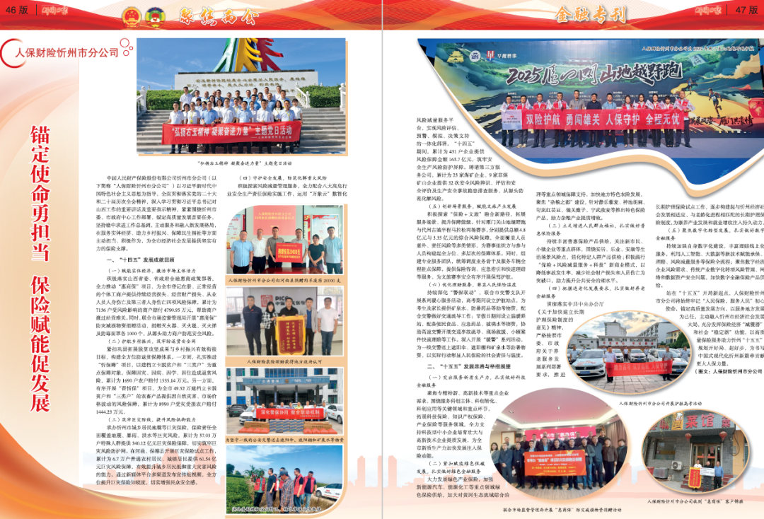 中國人民財產(chǎn)保險股份有限公司忻州市分公司(以下簡稱“人保財險忻州市分公司”)以習近平新時代中國特色社會主義思想為指導,全面貫徹落實黨的二十大和二十屆歷次全會精神,深入學習貫徹習近平總書記對山西工作的重要講話及重要指示精神,緊緊圍繞忻州市委、市政府中心工作部署,錨定高質(zhì)量發(fā)展首要任務(wù),堅持穩(wěn)中求進工作總基調(diào),主動服務(wù)和融入新發(fā)展格局,在服務(wù)實體經(jīng)濟、助力鄉(xiāng)村振興、保障民生福祉等方面主動擔當、積極作為,為全市經(jīng)濟社會發(fā)展提供堅實有力的保險支撐。