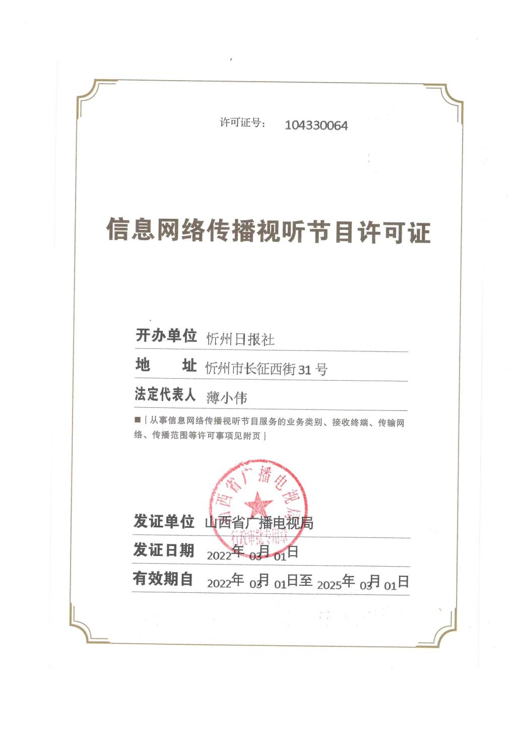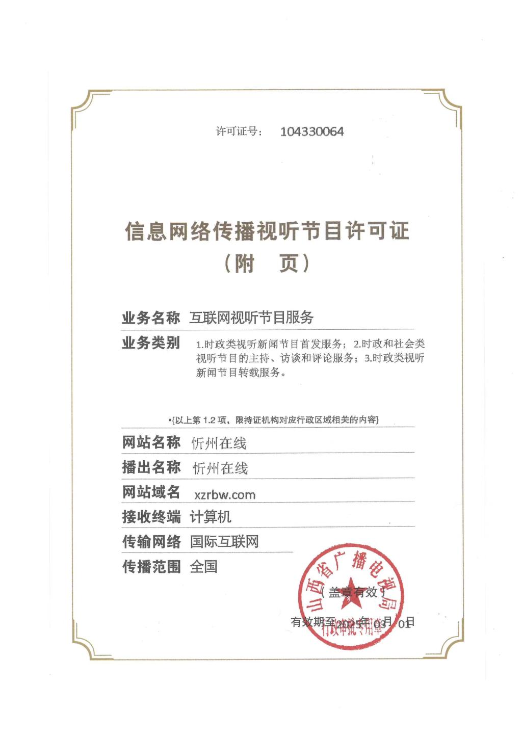 忻州在線信息網(wǎng)絡傳播視聽節(jié)目許可證