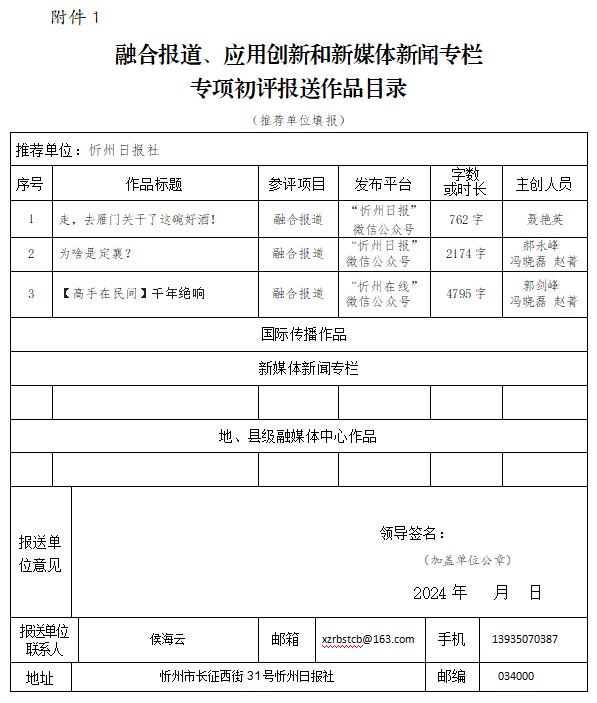 經(jīng)忻州日?qǐng)?bào)社編委會(huì)研究決定,以下作品擬推薦申評(píng)第33屆山西新聞獎(jiǎng),現(xiàn)予以公示。有反對(duì)意見(jiàn)者,請(qǐng)將反對(duì)意見(jiàn)書(shū)面報(bào)至統(tǒng)計(jì)考核部。