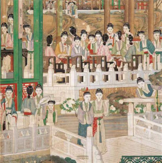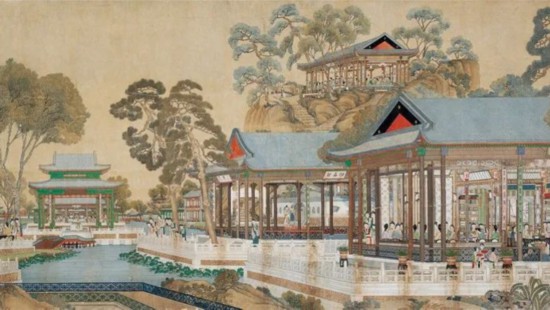 畫面中,曲折縈紆的溪水自蘅蕪院流經(jīng)牡丹亭、凹晶館、蓼風(fēng)軒、秋爽齋等地,最終蜿蜒向畫面遠(yuǎn)方,層層亭臺(tái)廊橋,一望無盡。許軍杰認(rèn)為,此繪之溪水應(yīng)為沁芳溪。正如周汝昌先生在《北京大觀園·引言》中評(píng)價(jià):“大觀園全部的主脈與‘靈魂’是一條蜿若游龍的‘沁芳溪’。亭、橋、泉、閘,皆以此二字為名,可為明證。一切景觀,依溪為境”,“大觀園的一切池、臺(tái)、館、泉、石、林、塘,皆以沁芳溪為大脈絡(luò)而盤旋布置?!眻D中的這曲溪水亦有異曲同工之功能,將兩岸建筑、山石、樹木巧妙地聯(lián)系在一起,使其形成一個(gè)有機(jī)的園林整體。(李君娜)