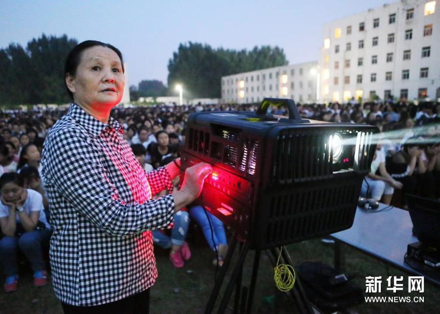 河南新華農(nóng)村數(shù)字電影院線有限公司郭建華為當(dāng)?shù)厝罕姺烹娪埃?017年8月22日攝)。新華社發(fā)