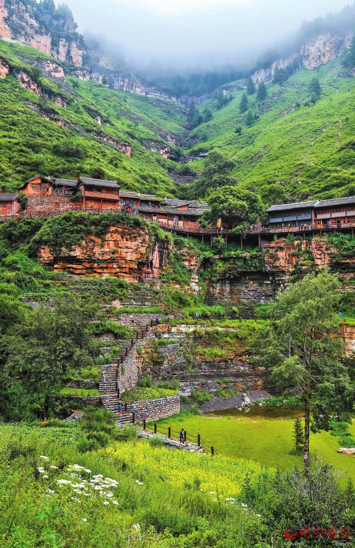 基巖構(gòu)造、河谷沖擊、垂直生態(tài)、冷涼氣候……有別于他處的雋永靈秀,寧武之境實(shí)乃神來(lái)之筆。懸空村位于寧武縣管涔山深處,現(xiàn)為蘆芽山風(fēng)景區(qū)的一個(gè)景點(diǎn),因村莊懸于峭壁之上而稱(chēng)奇。村里多以石頭和木材建房,村中唯一道路是由圓木搭起的空中棧道,行于其上,猶如走在半空,從崖底仰望,似空中樓閣,故而得名。