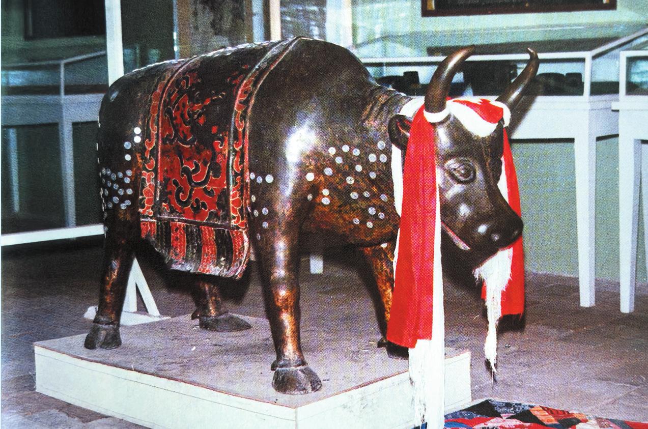五臺山保存著一尊工藝精細、形態(tài)逼真、傳神入化的明代銅牛。這尊堪稱鑄造藝術(shù)品中佳品的銅牛,收藏在顯通寺藏珍樓內(nèi),通高85厘米,長146厘米。它體魄雄偉,頭向前伸,分足而立,兩角內(nèi)收,閉嘴蓄力,圓目正視,奮力前行。銅牛四足協(xié)調(diào),造型逼真。銅牛的腰部有披墊,披墊上面繪有各種彩色花紋。銅牛原來還拉著一輛精致的銅車。車棚、輪、軸及車上的繩索均為銅質(zhì)。文物部門鑒定其為國家一級文物。