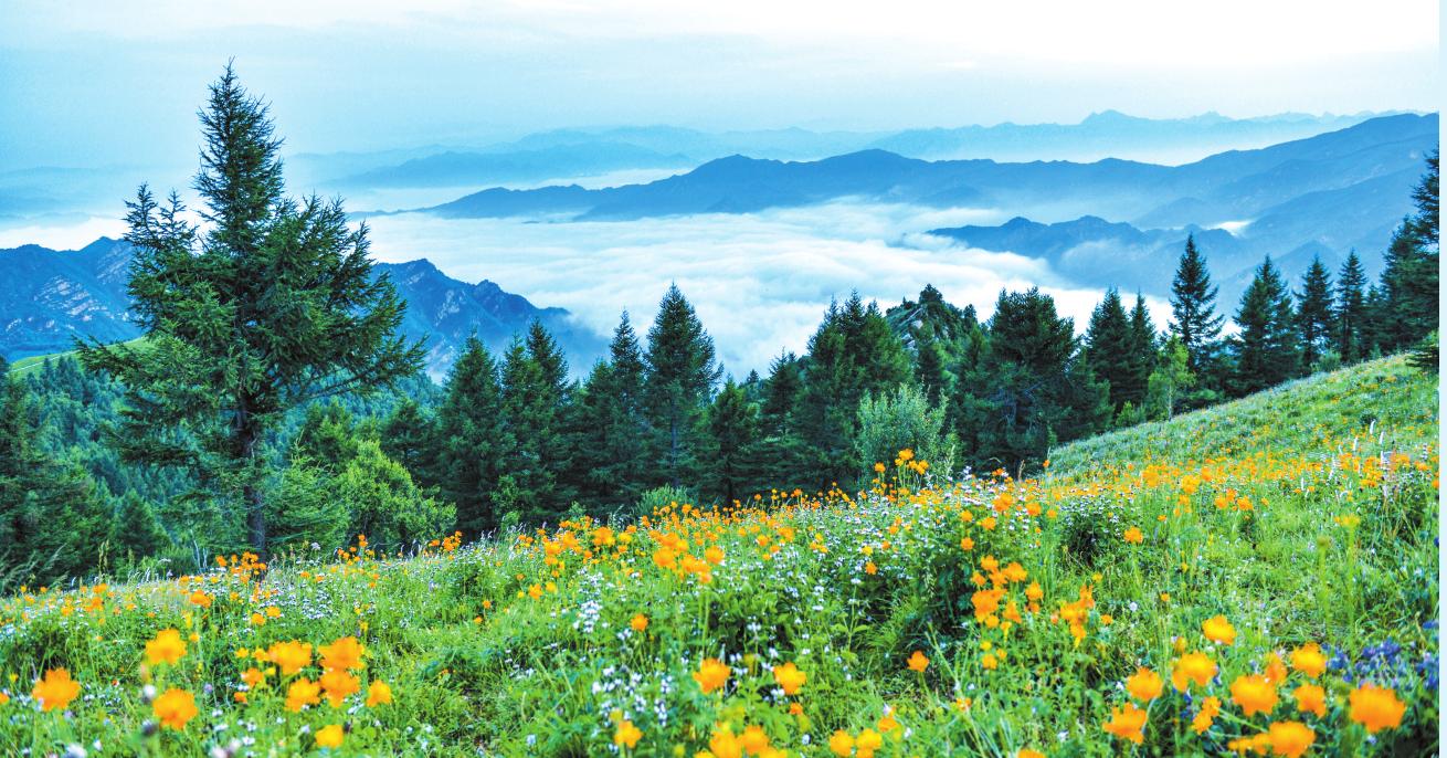 駝梁地形四周封閉,中為谷地,形成了山巒綿亙、溝壑縱橫、河川橫跨東西的自然生態(tài)景觀。其主峰海拔2281米,為“晉冀兩省四縣”交匯處,駝峰山巒蜿蜒,此起彼伏,猶如“靜臥巨駝”而取名駝梁。與五臺山風景名勝區(qū)東北相望,遙相呼應(yīng),有其獨特和不可替代之優(yōu)勢,同為五臺山旅游資源亮點。由山谷到山頂分布著落葉林混交林帶、樺樹林帶、落葉松林帶,生物垂直分布變化明顯。駝梁頂部,有一片亞高山草甸,約近萬畝的茵茵綠草,像碩大無比的地毯,與天際交接,一望無垠。隱于藍天白云和松林綠波之間,散落著漫山遍野的杜鵑花、金蓮花、百合花、燈籠花等,置身其間,如進花海,恍若仙境。因位于云霧縹緲的高山之巔,故被人譽為“云頂花海”。