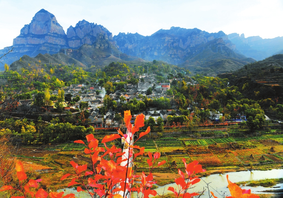 秋天的南莊是一個多彩的海洋。黃櫨和椿樹的紅葉像晚霞一樣映紅了山崖與河谷;燈籠一樣的金黃色柿子色澤誘人,掛在高高的柿樹上;依舊翠綠的花椒樹枝頭,一簇簇鮮紅的花椒若隱若現(xiàn);婆娑的黑棗樹上星星點(diǎn)點(diǎn),長滿褐色的果實(shí),沉甸甸的,壓彎了樹梢。