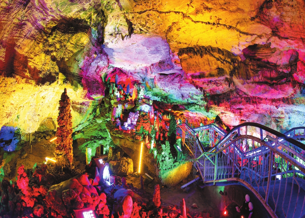 游客沿著精心設(shè)計(jì)的路線,可觀賞50多個景點(diǎn)。其中“群獅迎賓”,洞口一組石筍形似雄獅列隊(duì),栩栩如生;“金龜出洞”,巨石形成的龜狀奇石,仿佛正探秘人間;“瑤池仙境”與“蓬萊仙島”,燈光下的石幔如天宮云霞;“鎮(zhèn)海寶塔”,高1.8米的花團(tuán)狀石塔,景象奇麗。最令人驚嘆的是洞內(nèi)的“冰瀑世界”。在水晶洞和一線天區(qū)域,巖溶從洞頂傾瀉而下,形成各種瀑布奇觀:有如長白山瀑布的白練懸空,有如黃果樹瀑布的氣勢恢宏,還有黃巖大瀑布的玲瓏剔透。一處名為“禹王觀瀑”的景點(diǎn),更讓游人仿佛看見大禹治水時(shí)三過家門而不入的身影。