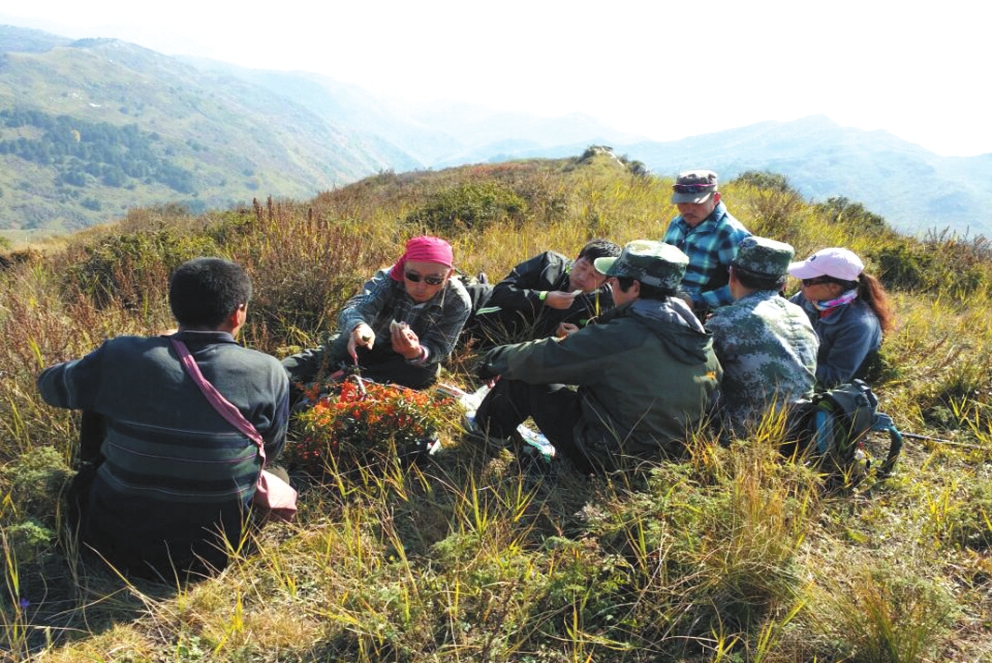 再向前,是一片更茂密的荊棘林,坡度更陡了,大家顧不得叢林中有刺,相互攙扶著向前走。上面是刺人的荊棘,下面是萬丈深淵,腳下的草有點(diǎn)濕滑,一旦踩空,可能粉身碎骨。羊倌一直提醒注意腳下,踩實(shí)了再邁步,真是心驚膽戰(zhàn)。幸好前面出現(xiàn)了一處空地,大伙得以小憩,喝點(diǎn)水,補(bǔ)充一下體能。有三人主動放棄登頂,大伙商議后,剩余十人決定繼續(xù)前進(jìn),完成登頂夙愿。三人原地守候,等大伙返回后會合。