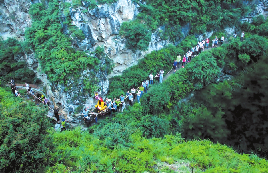上山的路越來越難走,也越來越危險(xiǎn)。前方是峭壁,只容一人通過,腳下便是萬丈深淵,一旦失足,后果難料。女士們有點(diǎn)害怕。朱部長一邊鼓勵(lì),一邊教她們要領(lǐng):踩實(shí)、抓穩(wěn)、不要向下看。前面幾位戰(zhàn)戰(zhàn)兢兢相繼通過,最后一位女士微胖,滿臉汗珠,雙腿打顫,人們都為她捏了一把汗,好在有驚無險(xiǎn)。