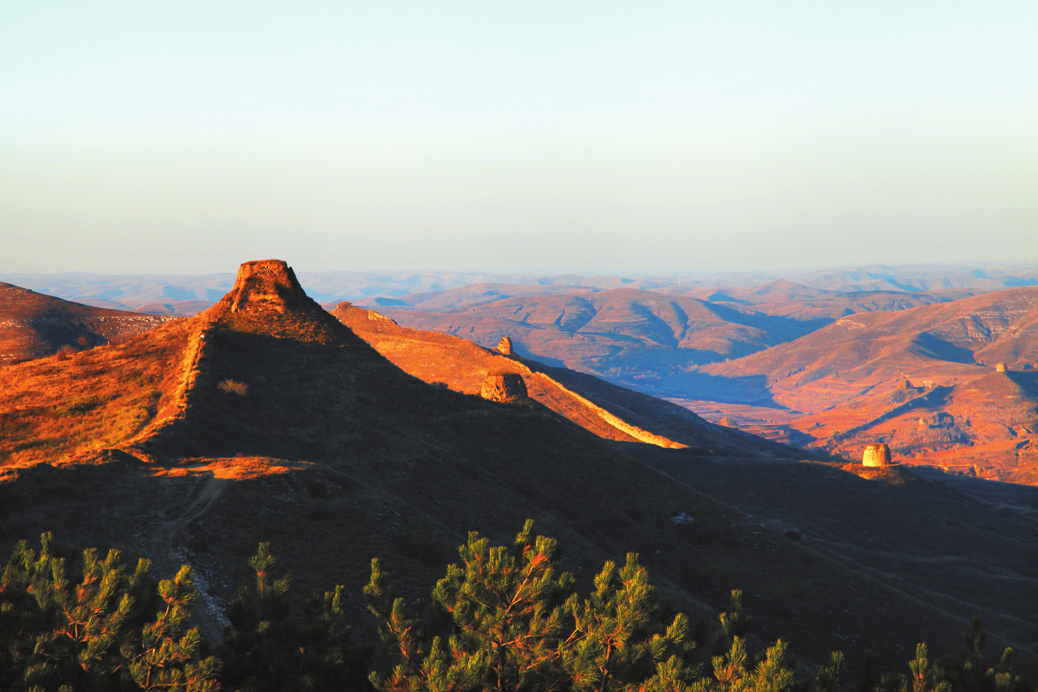 站在雄偉的柏楊嶺主峰上,迎風(fēng)而立,可看到連綿的大好河山和縱橫交錯的內(nèi)外長城。偏關(guān)境內(nèi)表里河山,營堡、敵樓、望臺星羅棋布、烽堠聳立,彰顯著偏關(guān)首御、三關(guān)重鎮(zhèn)的地位。與綠波蕩漾的大片油松林帶以及紅黃相間的落葉松林帶相映襯,更顯得山河壯麗。