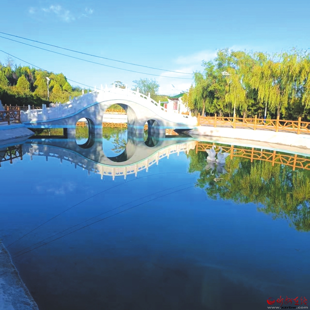 沿路而下,過(guò)橋爬坡,便到了天鵝湖。誰(shuí)能想到,這碧水涵虛的景致,原是當(dāng)年造林蓄水的大水坑?工程完工后順勢(shì)修整,竟成飛龍山又一勝景。天鵝湖呈葫蘆狀,漢白玉拱橋橫跨腰間如玉帶,橋東石雕飛龍昂首欲飛,橋西石雕雙鵝戲水憨萌。湖水清澈見(jiàn)底,倒映藍(lán)天白云綠樹(shù),風(fēng)過(guò)時(shí)漣漪擴(kuò)散,美得讓人心醉,連時(shí)間都慢了下來(lái)。