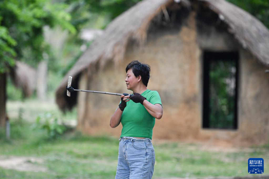 4月28日,游客在海南省東方市白查村參觀、拍攝黎族船型屋。