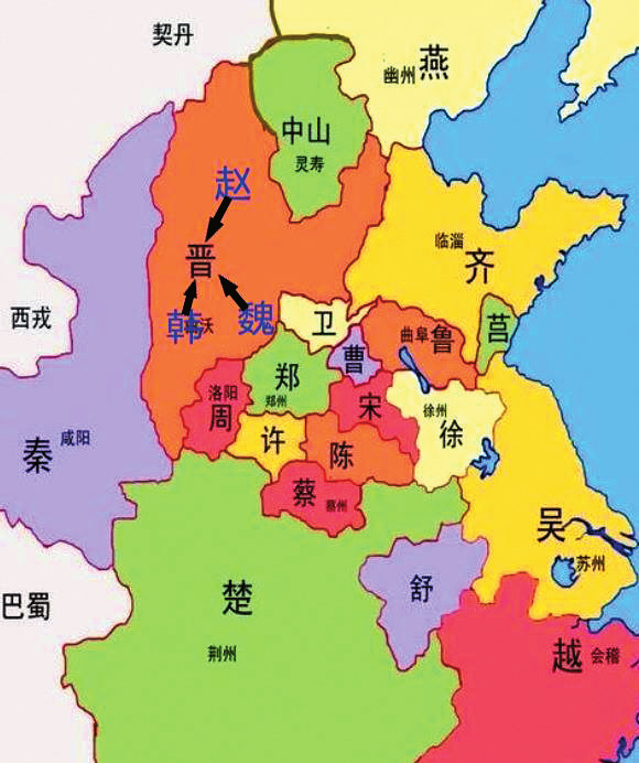 晉文公執(zhí)政繼承其父三軍六卿制,韓、趙、魏、范、智、中行六卿各有自己的領(lǐng)地,勢力日漸擴(kuò)張,他們一方面維護(hù)晉國霸業(yè),另一方面蠶食晉國君權(quán)和國土。到晉定公時(shí)期,晉國權(quán)勢趨向衰弱,六卿之間也相互蠶食領(lǐng)地。晉出公時(shí)期,智氏組織韓、趙、魏討伐范氏和中行氏,迫使二氏出逃,后韓、趙、魏、智四家瓜分了范氏和中行氏所有封地。四氏中,智氏領(lǐng)土最多,勢力最強(qiáng),故向韓、趙、魏索要所得封地,韓、魏懼而滿足智氏要求,趙斷然拒之,被迫出逃,智氏組織韓、魏擊之未成。事后,韓、魏共識前車之鑒,唇亡齒寒,于是韓、趙、魏三卿聯(lián)合擊智,盡滅智氏全族。