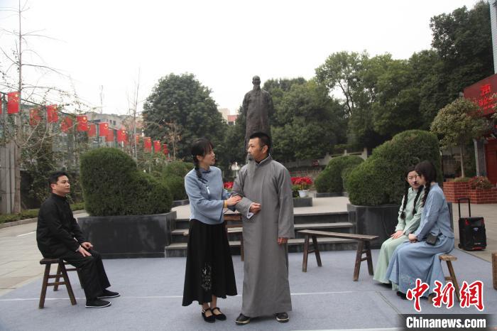 張瀾在教育子女時(shí)誕生了很多有意義的小故事,我們選取了其中幾個(gè),編排成15分鐘的情景劇。情景劇這種形式,第一個(gè)優(yōu)點(diǎn)是時(shí)間短,游客來(lái)紀(jì)念館參觀(guān)——預(yù)計(jì)參觀(guān)1個(gè)小時(shí)吧,花15分鐘看這出劇,輕輕松松就能看完;第二個(gè)優(yōu)點(diǎn)是不占地方,我們一般在紀(jì)念館的銅像廣場(chǎng)演出,下雨的話(huà)就改到展廳里做室內(nèi)演出。我們這兒是古建筑,在里面演出是很有感覺(jué)的。