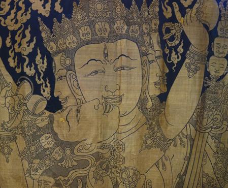 ▲永樂(lè)御制紅閻摩敵刺繡唐卡(局部)。(圖片來(lái)源:中新網(wǎng))
