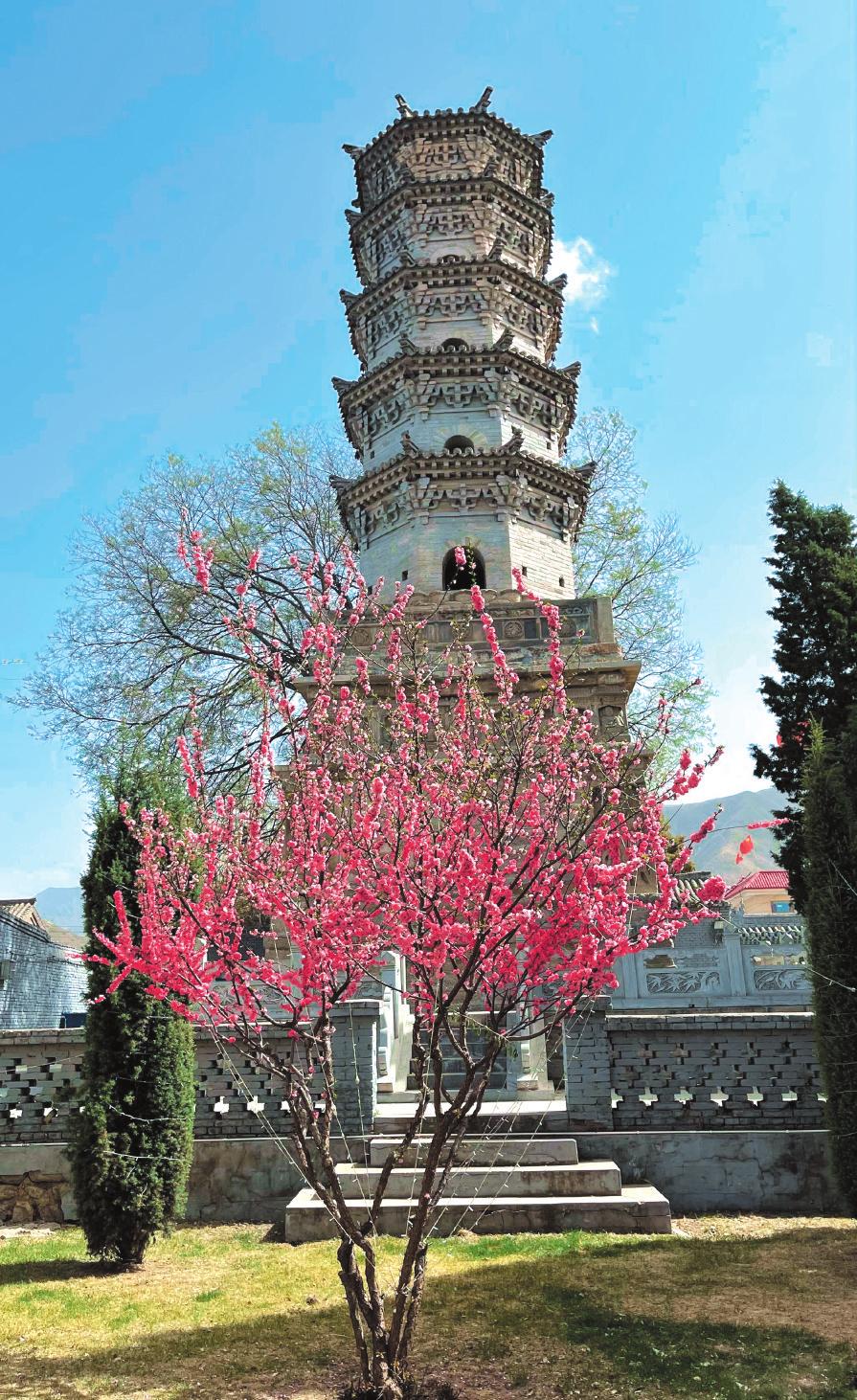磚塔坐北朝南,占地面積75.7平方米,通高約19米,為八角五層樓閣式磚石塔。塔基石砌,平面呈方形,由上下兩部分組成,底邊長(zhǎng)8.7米,高6.6米。下層每面兩側(cè)浮雕金剛各1尊,南側(cè)辟券門成塔室,上層為須彌座,束腰處每面雕屋形龕9個(gè),內(nèi)雕坐佛各1尊,其上設(shè)圓形仰蓮?fù)兴恚闹茉O(shè)勾欄。塔身平面呈八邊形,五層中空,每層塔檐下設(shè)仿木磚雕斗拱,五踩重昂,各層四面均設(shè)有券洞,八角攢尖頂,中央設(shè)覆缽,寶珠塔剎。2004年公布為省級(jí)文物保護(hù)單位。