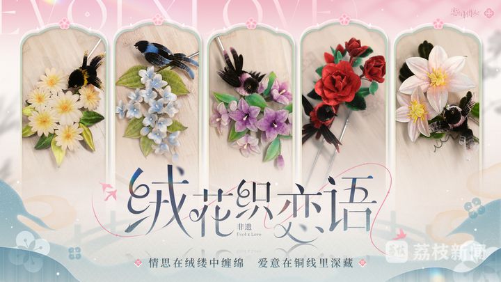 作為親歷過(guò)絨花發(fā)展巔峰與谷底時(shí)刻的技藝傳承人,趙樹(shù)憲深知,若想讓絨花在新時(shí)代煥發(fā)生機(jī),必須進(jìn)行創(chuàng)新和改良。他鼓勵(lì)工作室的年輕人對(duì)絨花的造型、用途進(jìn)行創(chuàng)新,也總是保持著開(kāi)放的態(tài)度與不同的品牌及行業(yè)進(jìn)行跨界合作。