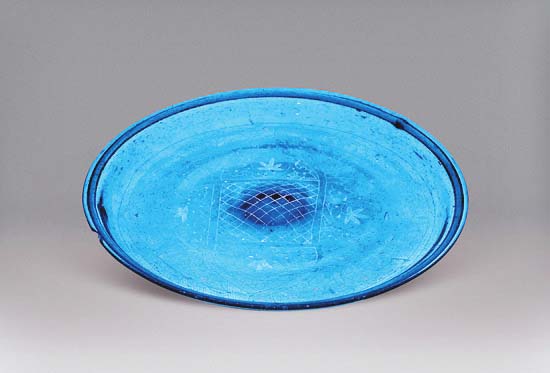 據(jù)地宮出土的物賬碑記載,整個(gè)地宮被布置得“窮天上之莊嚴(yán),極人間之煥麗”。在這些文物中,有六件來自阿拉伯國家的刻紋藍(lán)玻璃盤。玻璃盤保存完好,為無模吹制成形,通體藍(lán)色,晶瑩光潔,盤面刻滿紋飾,主體紋飾為以雙線勾勒出的十字形框架,盤心為正方形方框,方框外刻四個(gè)拱門形狀的尖瓣,與中心方框組成四個(gè)“米哈拉布”紋樣?!懊坠肌笔且了固m教清真寺大殿的禮拜龕,四個(gè)尖瓣內(nèi)各刻一朵五瓣葉子植物紋,尖瓣之間也飾以植物紋。制作工藝是在玻璃成器之后,用比玻璃更堅(jiān)硬的工具在其表面淺刻花紋,加以描金,從而使得玻璃盤更為華麗。