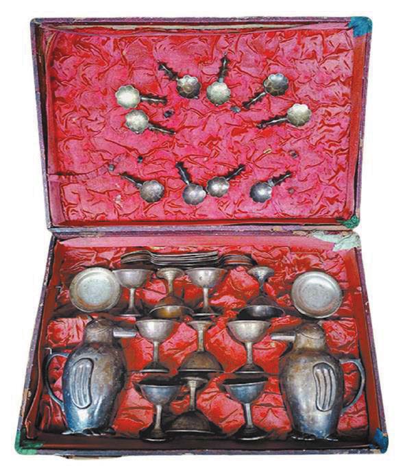可惜該壺的用途一直未能確定,是酒壺、是茶壺,還是咖啡壺?現(xiàn)在入手了一套帶有包裝盒的整套器具(壺具2把,高腳杯、小圓盤、調羹和調羹架各10只),茅塞頓開,這應該是咖啡壺套裝。從包漿和使用痕跡看,這套企鵝形銅質鍍銀咖啡壺很可能是20世紀初生產的。