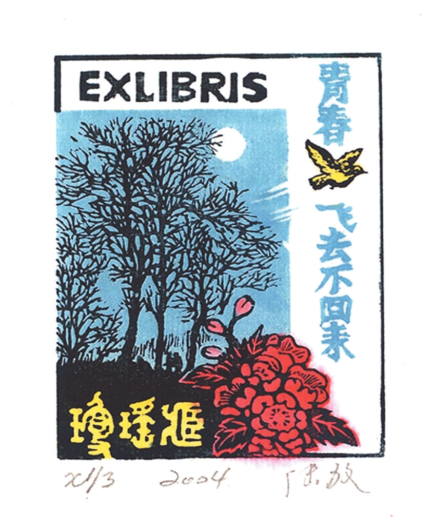 創(chuàng)作一枚專屬于自己的水印木刻藏書票,是一場頗富詩意與匠心的藝術之旅。從構思到設計,從刻板到印刷,充滿著創(chuàng)作者對文化的敬畏、對書籍的熱愛以及對美好的期許。水印木刻藏書票的制作并不簡單,會經歷各種各樣的意外——紙張的濕度、顏色的厚薄、錯版等都會影響畫面效果。但這何嘗不是一次深度的文化體驗?在設計中認知自我,與書籍神交;在勞作中體悟精益求精的工匠精神;在印制中領略千變萬化的色彩韻味。當用刻刀在木板上刻下自己的名字,馬蓮在紙的背面輕輕摩擦,墨色慢慢洇化,心靈在方寸之間得到浸潤。如果把創(chuàng)作過程寫成一本書,水印木刻帶來的奇妙感受將是書中最精彩的情節(jié)。