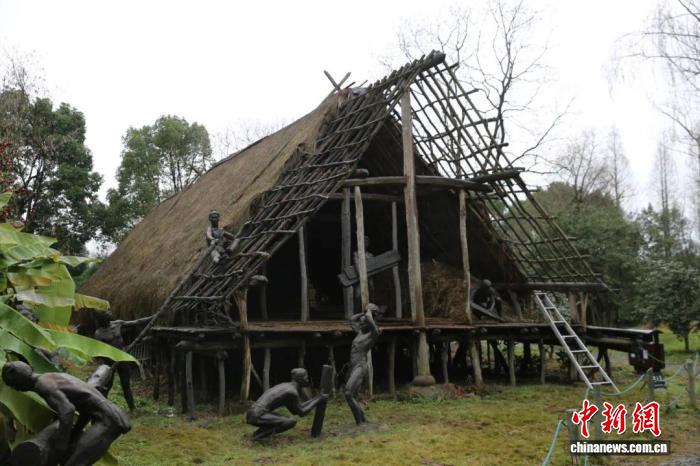 河姆渡遺址干欄式建筑復原圖(資料圖)。 (寧波市文化遺產(chǎn)管理研究院供圖)