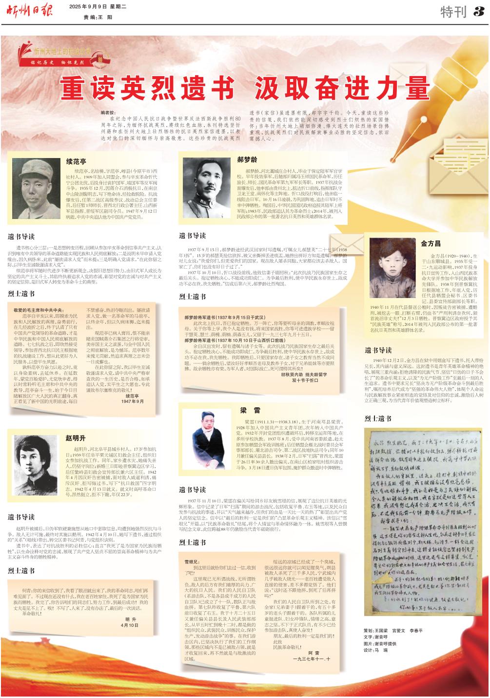 在紀(jì)念中國人民抗日戰(zhàn)爭暨世界反法西斯戰(zhàn)爭勝利80周年之際,為緬懷抗戰(zhàn)英烈,賡續(xù)紅色血脈,本刊特選登忻州籍和在忻州大地上壯烈犧牲的抗日英烈家信遺墨,以表達(dá)對(duì)他們的深切緬懷與崇高敬意。這些珍貴的抗戰(zhàn)英烈遺書(家信)雖遺墨有限,卻字字千鈞。今天,重讀這些珍貴的信箋,我們依然能深切感受到烈士們熾熱的家國情懷:當(dāng)年忻州大地上硝煙彌漫、烽火連天的壯烈場景仿佛重現(xiàn),抗戰(zhàn)英烈們對(duì)民族解放事業(yè)必勝的堅(jiān)定信念,依舊震撼人心。