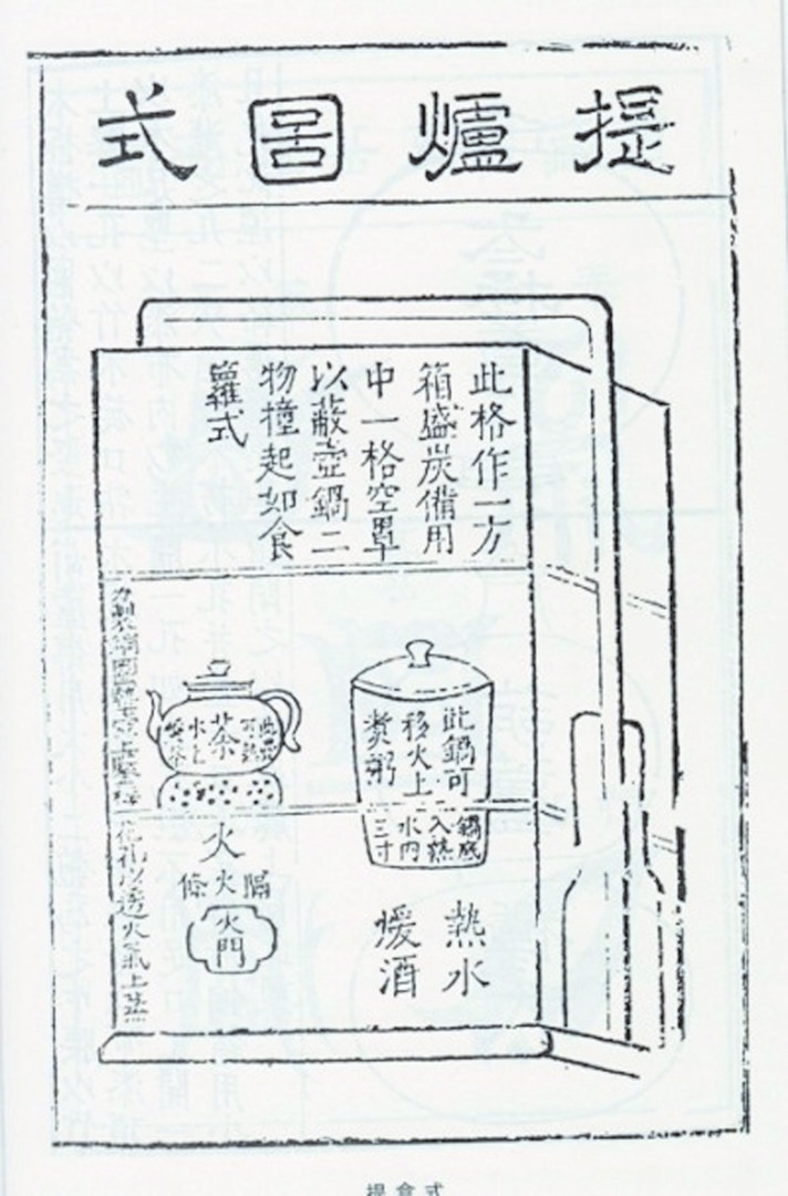 根據(jù)文字與插圖可以看出,提爐的靈感來自當時普遍使用的“三撞”,即三層式提盒,由可以靈活組裝或分卸的幾部分組成,包括一個帶有底座的提梁架、兩層方屜盒、一個四方形圍框,以及一只銅質(zhì)四方形的水火爐。兩層屜盒與四方形圍框在外徑上尺寸一致,且彼此采用子母口套合,可以按照一層屜盒在下、四方形圍框在中、一層屜盒在上的形式疊置,并依靠子母口嵌合牢固。下層方屜盒的外徑尺寸要與提梁架底座上的淺凹槽正好相當,這樣在移動過程中,屜盒就能牢固嵌置在底座的凹槽內(nèi),不會脫落。整套配置中最重要的組件是一只小銅火爐,這只銅爐亦為四方形,外徑與下層屜盒的內(nèi)徑相當,可以恰好放置在屜內(nèi),不會晃動。此爐之所以名為“水火爐”,是因為爐體的內(nèi)部用銅板隔為左右兩個用途不同的區(qū)域,分別發(fā)揮煮水風爐與燙酒器的功能。左半部的頂面安有圓形灶,可以放入火炭,在其側(cè)壁上則開有火門,用以通風、清灰,因此只要將特制的茶壺置于灶上,就可以隨時生火煮水,沖茶品茗;右半部則僅在頂面開有一個圓口,使用的時候通過圓口向內(nèi)注入熱水,然后把一只與圓口大小相配的帶蓋小桶放入其中,再把酒注入小桶,將酒燙熱。小桶是為了組合方便精心設計的,還可以擔任袖珍煮鍋的角色,故《遵生八箋》中稱其為“小鑊”。游玩中肚子餓時,還可以隨時把這只小桶放到灶口上,煮粥或者其他便于快速制作的飲食,就地來一頓野餐。