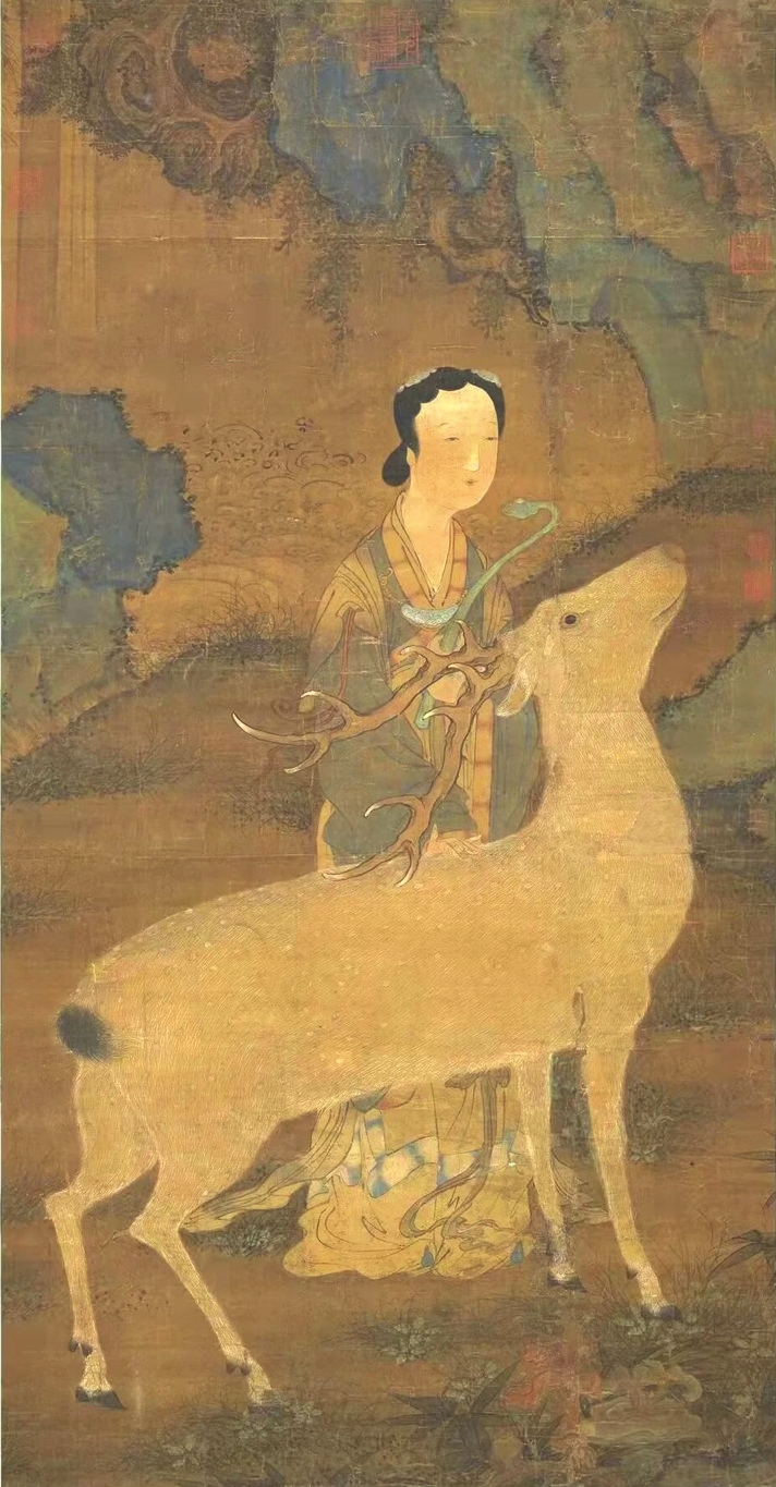 在傳統(tǒng)文化中,鹿是一種有神力的動(dòng)物,神話傳說中鹿往往是神仙的坐騎。李白一生尋仙問道,其《夢游天姥吟留別》中有“且放白鹿青崖間,須行即騎訪名山”之名句。南極仙翁的白鹿,不僅被繪制在壽畫里,在文學(xué)中也大放異彩。《西游記》中的白鹿精就是壽星南極仙翁的坐騎,偷得壽星的蟠龍拐杖后下凡為妖。在《白蛇傳》里,白娘子獨(dú)闖昆侖山,欲盜取起死回生的靈芝仙草,遭遇鶴、鹿二仙童阻攔。清代神魔小說《女仙外史》中的鹿童化為道人,下凡后為禍人間。屢破票房紀(jì)錄的動(dòng)畫電影《哪吒2》,其中的反派之一鹿童,是無量仙翁的大弟子,擔(dān)任捕妖隊(duì)頭領(lǐng),戲份頗重。