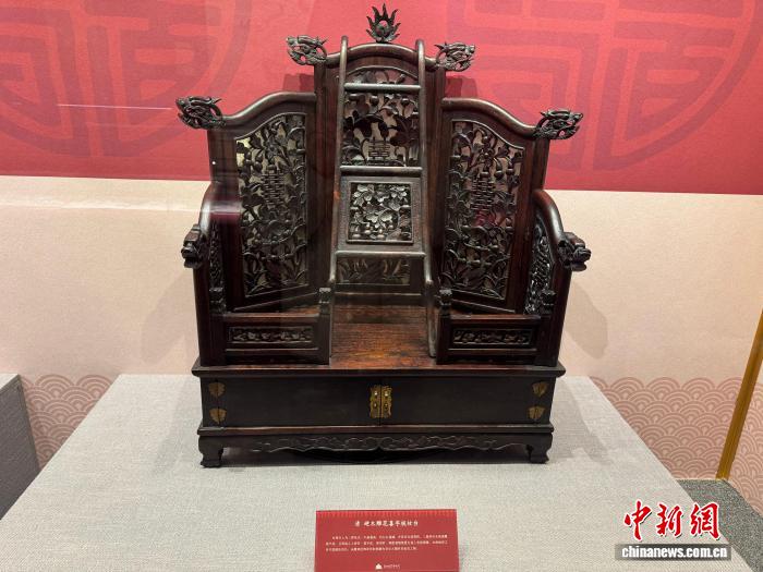2月12日,“丹宸國色——沈陽故宮博物院建院百年新春特展”在沈陽故宮開展。圖為展覽中展出的清硬木雕花喜字梳妝臺。中新社記者 韓宏 攝