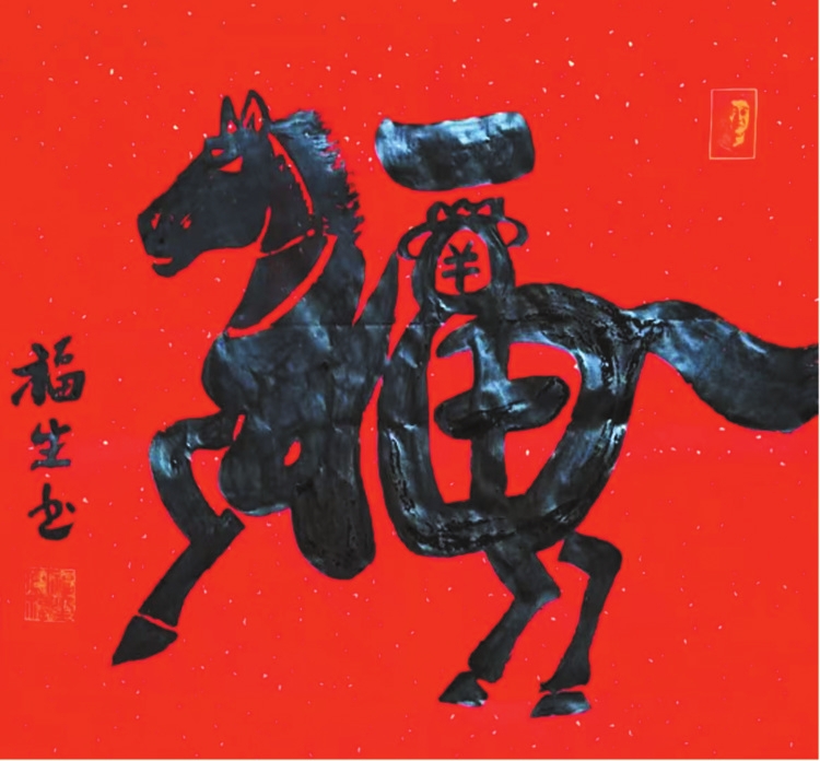 生肖文化,是中華民俗之根脈,王福生緊扣福字主題,應(yīng)時而作,應(yīng)物而書,將十二生肖意象與福字完美融合,創(chuàng)作出獨具氣象的“生肖福”系列,合于《道德經(jīng)》“動善時”的智慧——順天時,合地利,應(yīng)人心,與時俱化。其馬年“馬上?!笨胺Q福字神品:以草書筆勢,將“?!迸c“馬”渾然合一,“礻”為駿馬昂首,鬃毛飛揚(yáng);“畐”為身軀矯健,奮蹄向前;“田”化為鞍飾,點睛傳神。整幅福作一氣呵成,筆走龍蛇,靈動奔放,卻又穩(wěn)而不飄,勁而不躁,正是老子“知其雄,守其雌”的筆墨體現(xiàn)。